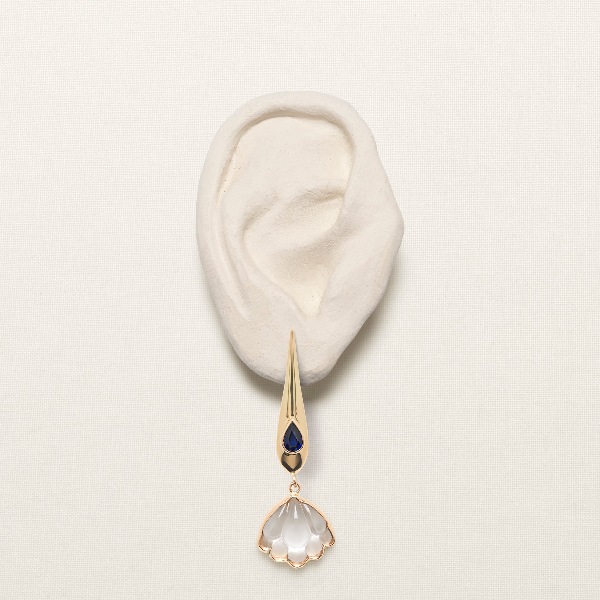This single earring is hand-cast into a dewdrop shape in gold dangling on the lobe with a lotus-shaped crystal. The crystal lotus is hand-carved by an expert artisan, using an age-old, stone-carving technique. Crystal is known as one of the most powerful and healing stones, it’s known to energize both the physical, emotional, and energetic body.