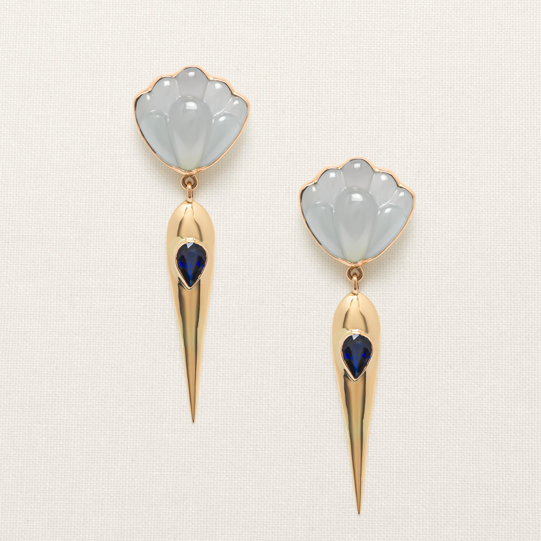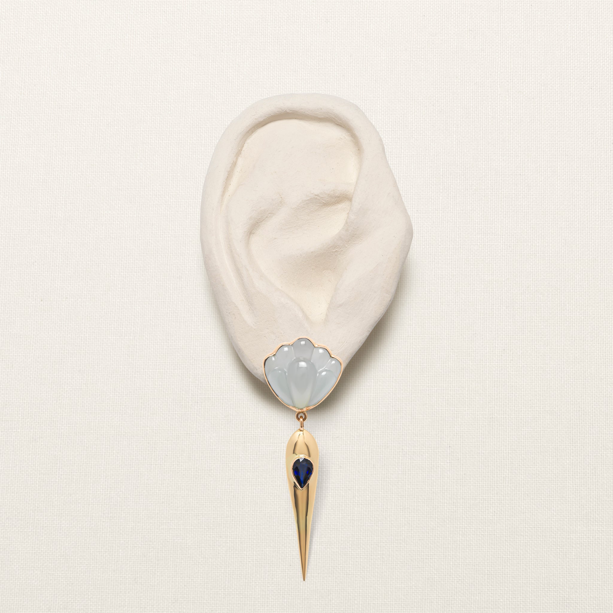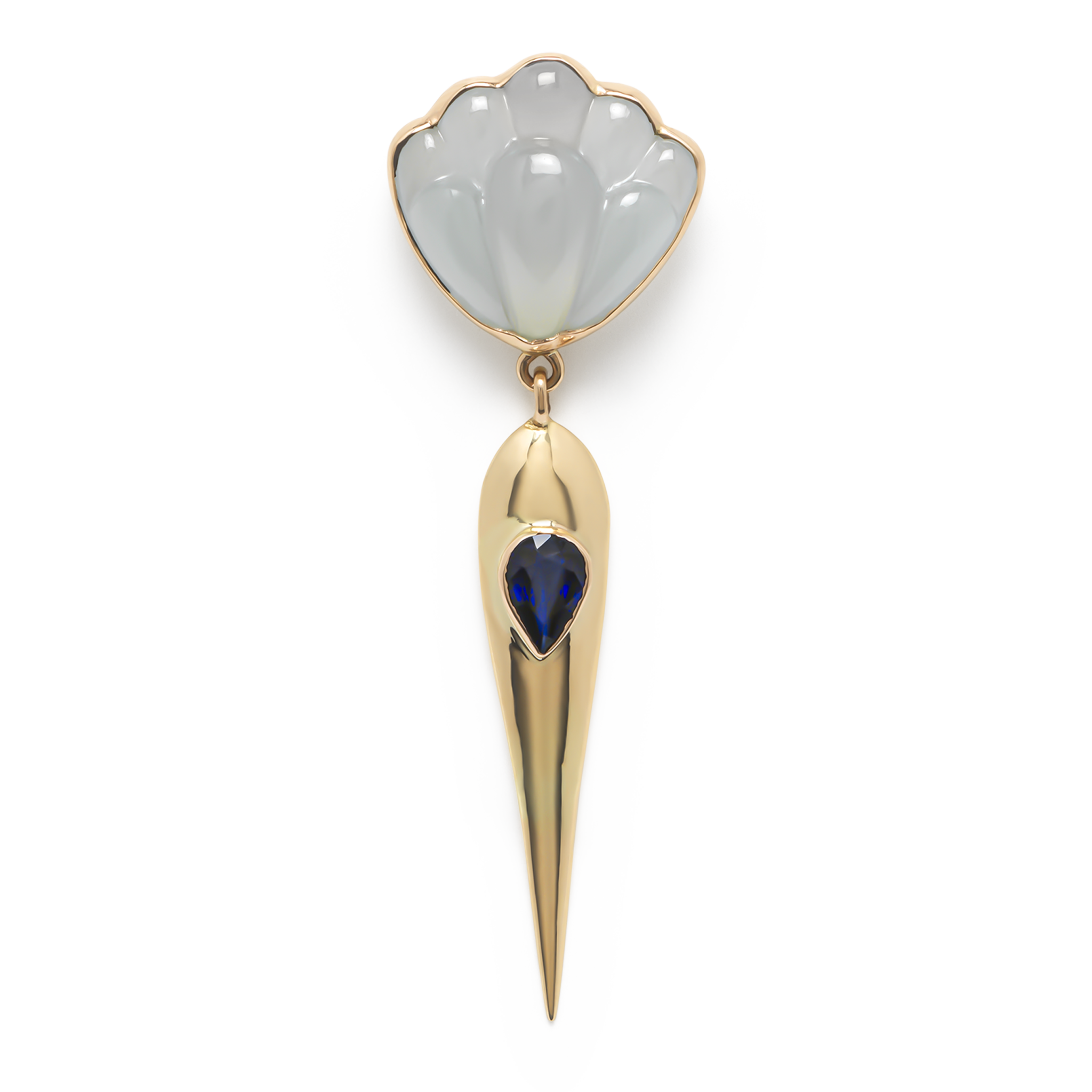 The solid golden drop is adorned by a pear-shaped sapphire, the stone of focus and discipline.