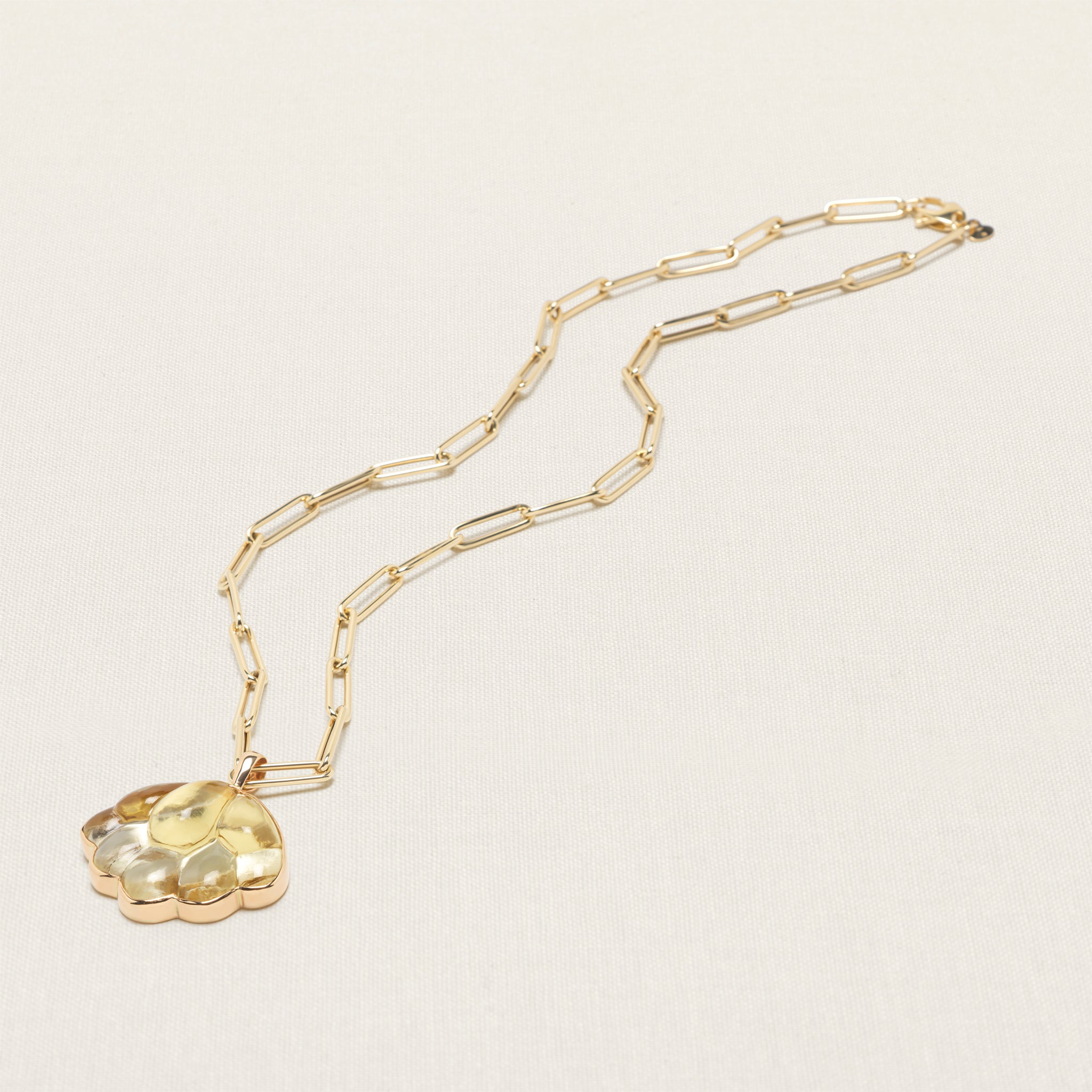 This pendant is hand-carved from citrine into the shape of a lotus by an expert artisan, using an age-old, stone-carving technique. The citrine gemstone symbolizes happiness and light and opens you up to positive opportunities