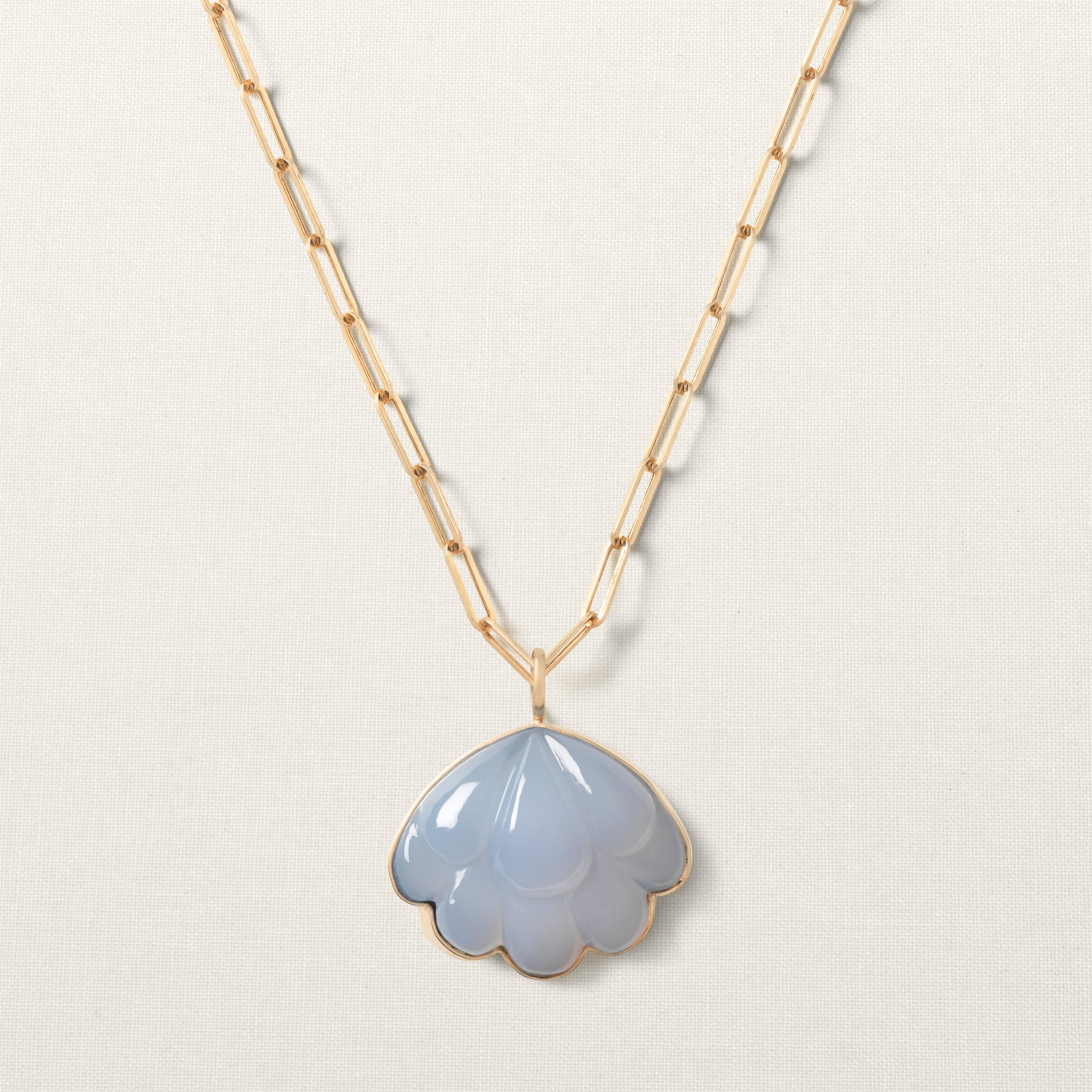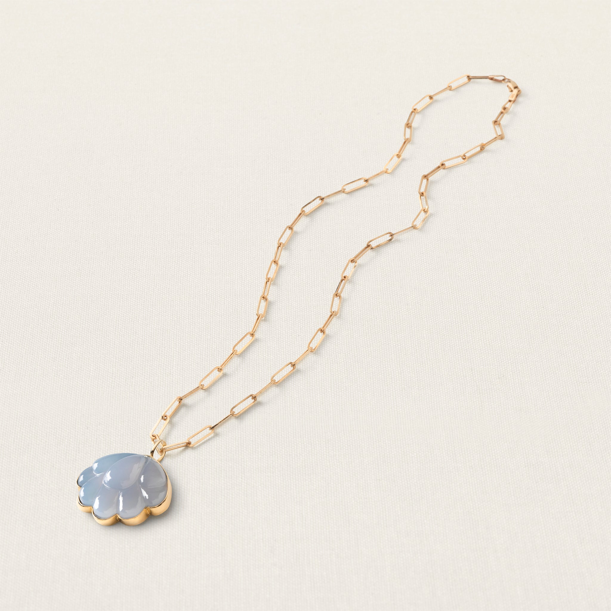 This pendant is hand-carved from chalcedony into the shape of a lotus by an expert artisan, using an age-old, stone-carving technique. Blue chalcedony restores calm and balance.