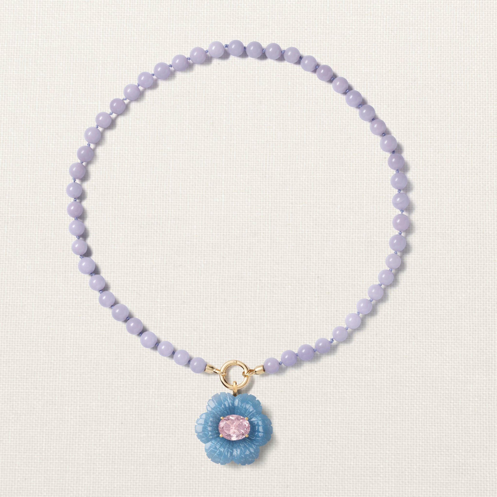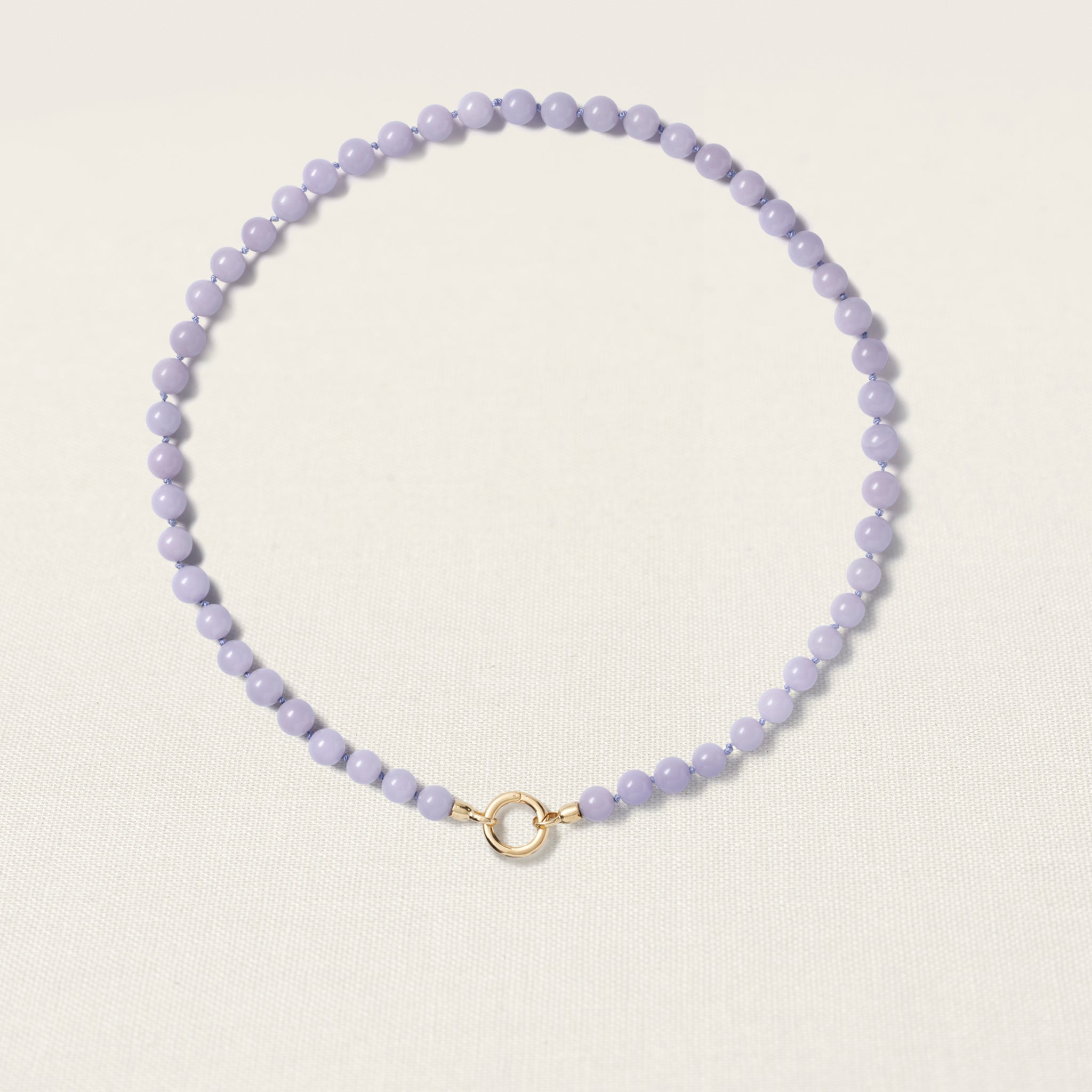 Introducing our exquisite new necklace, hand-carved from high-quality yttrium fluorite. Each bead is a perfect 8mm round. The necklace features a 14k gold round clasp. This clasp allows you to effortlessly click on any of our flower pendants, giving you the freedom to customize and play around with your look.