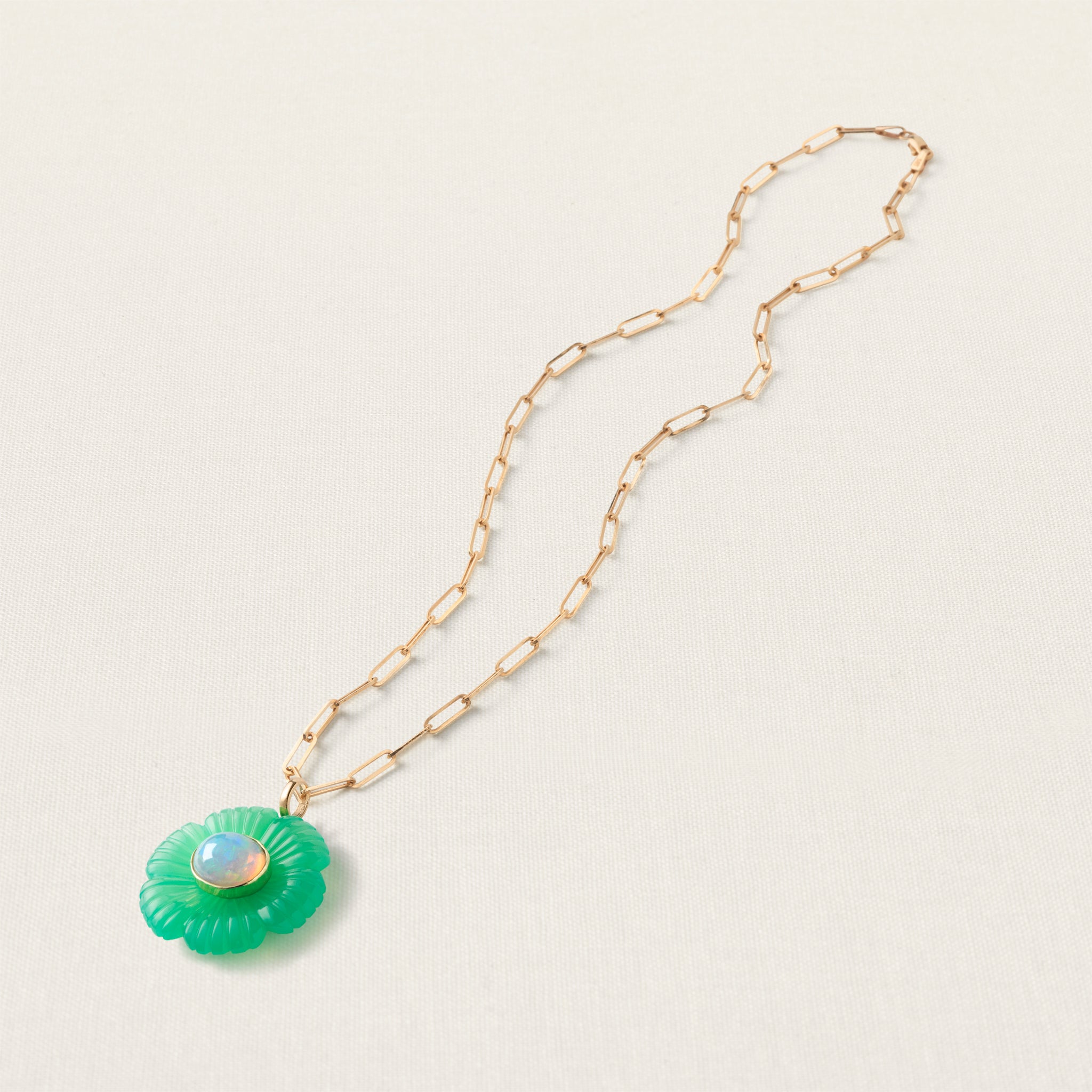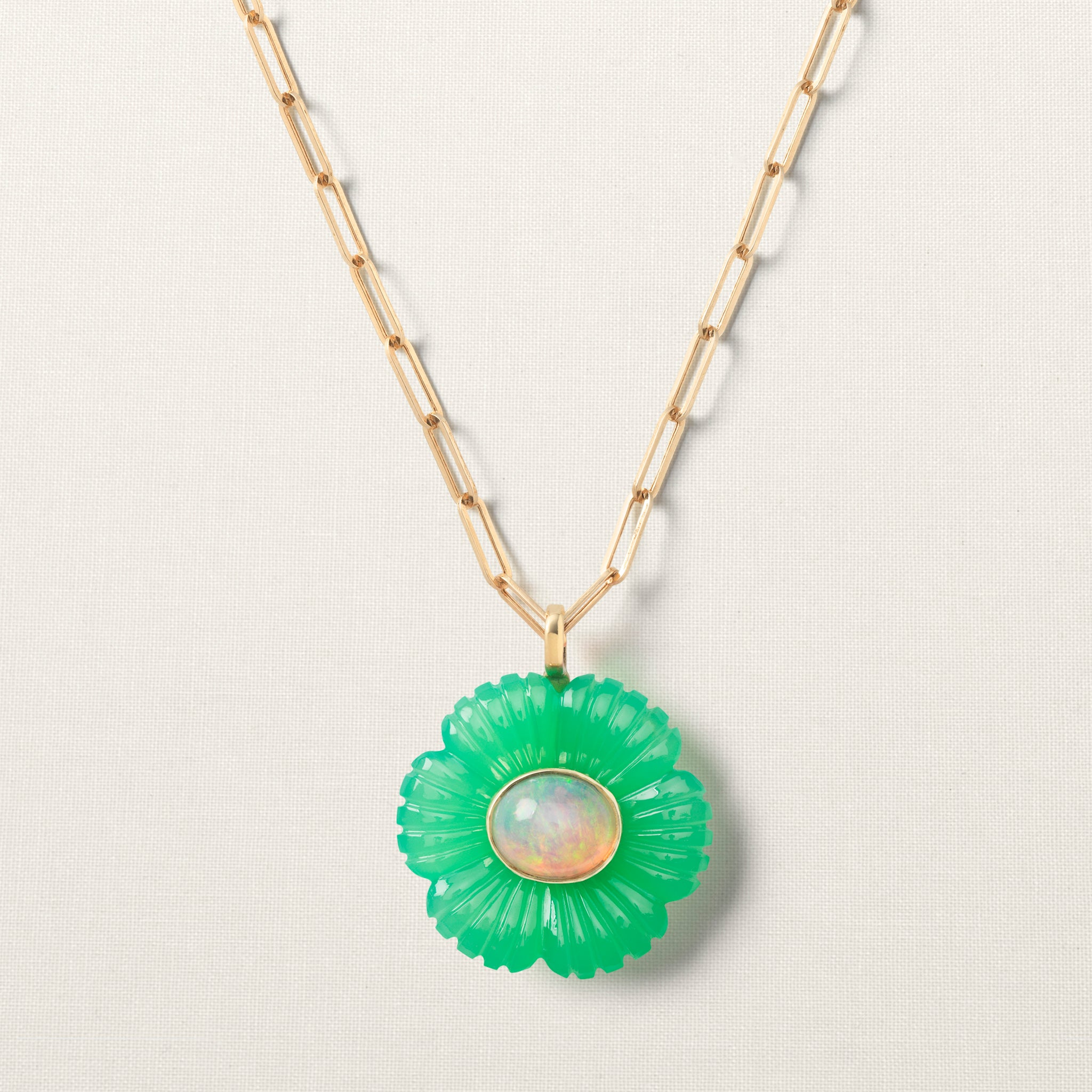 The pendant is set with a cabochon-cut Ethiopian opal, which symbolizes grounding for the emotional body and is hand-cast from 14-karat recycled gold.