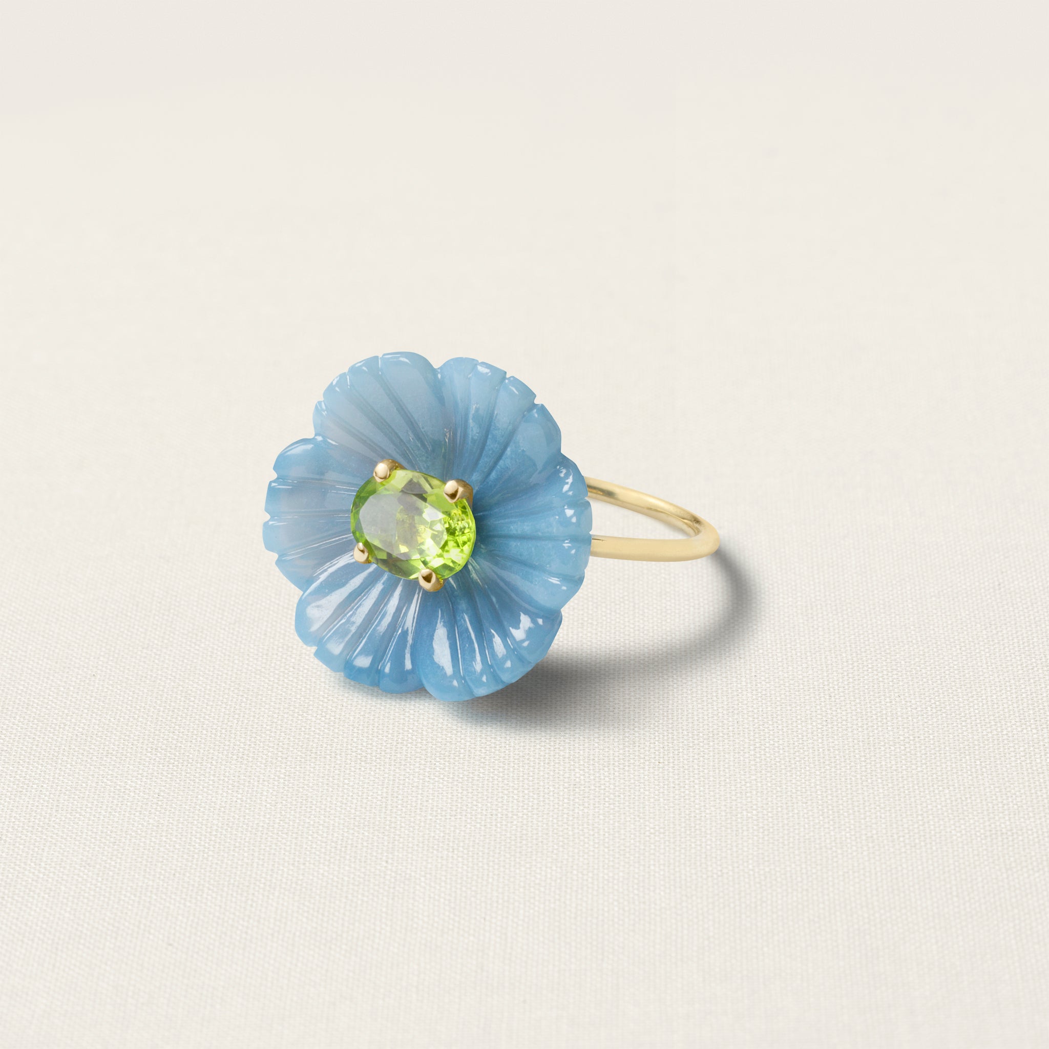 The flower on this iconic Sophie Joanne ring is hand-carved from blue opal by an expert artisan, using an age-old, wood-carving technique. Blue Opal is good for creativity, communication, and the courage to speak your mind.