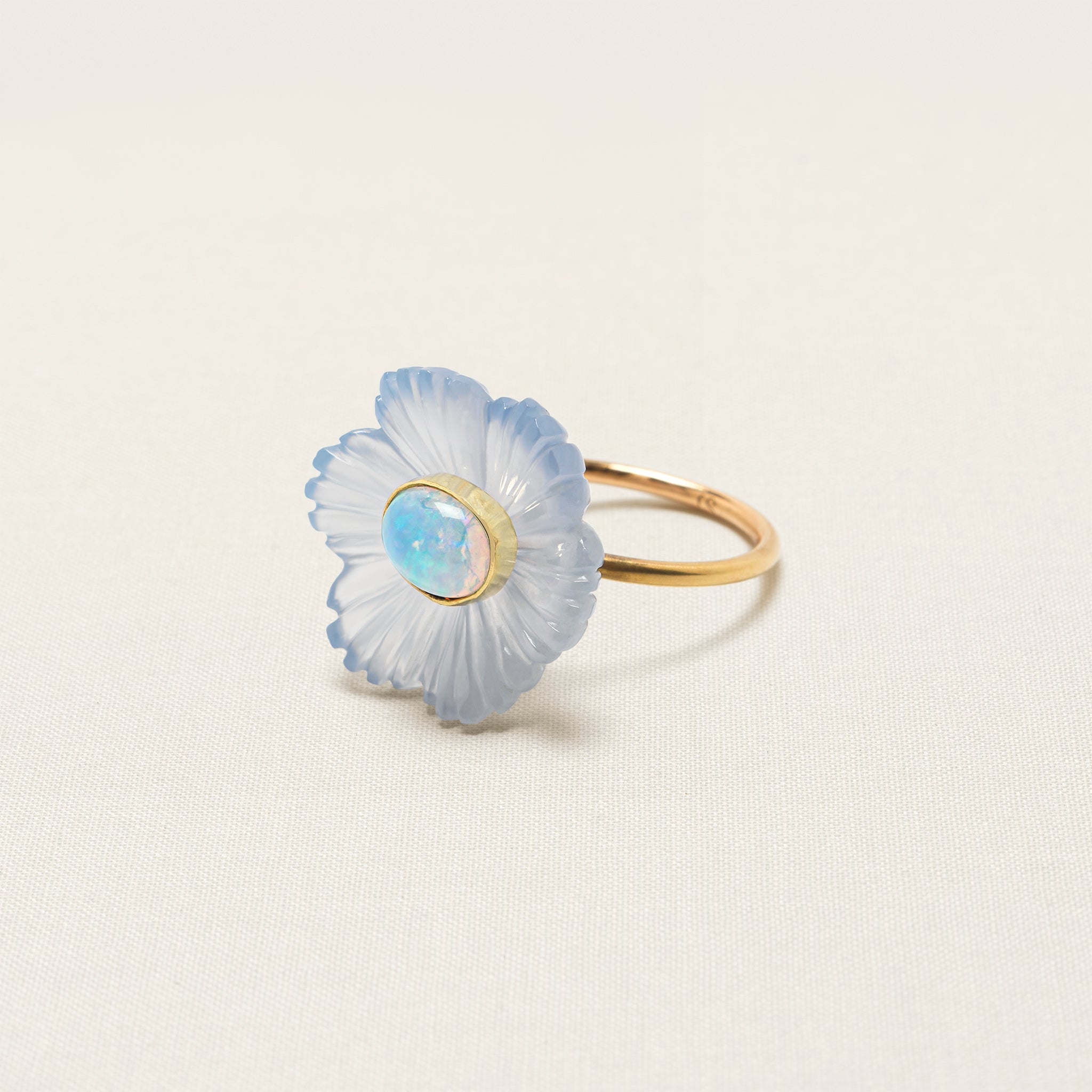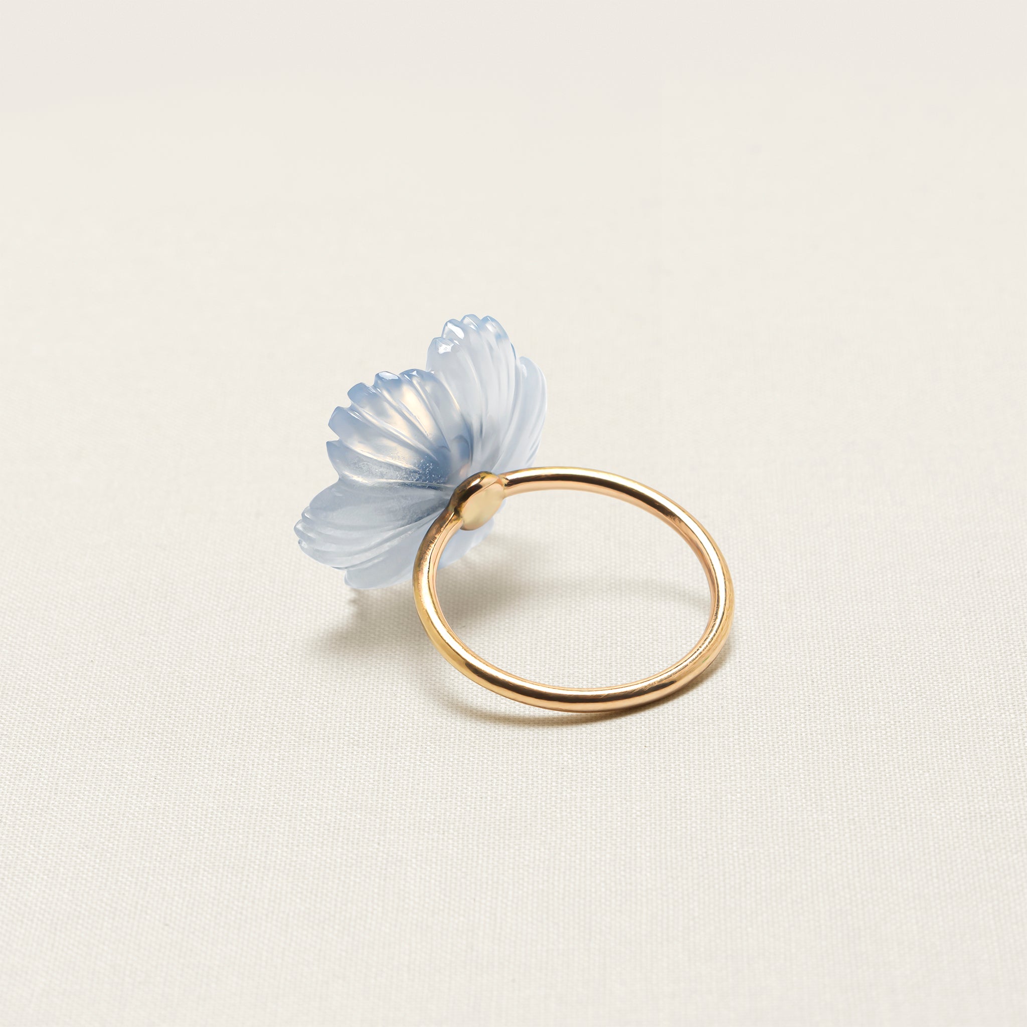 The flower on this iconic Sophie Joanne ring is hand-carved from chalcedony by an expert artisan, using an age-old, wood-carving technique. Blue chalcedony restores calm and balance.