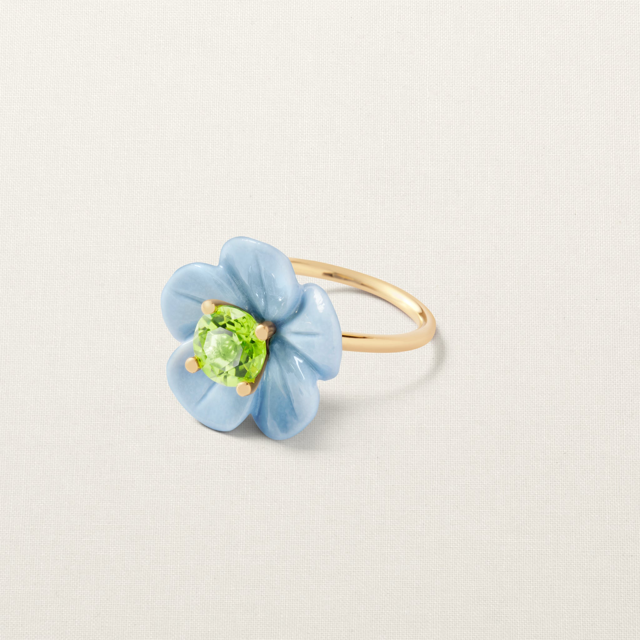 Inspired by the Flowers of Lanzarote. The Pinky Flower ring is hand-carved in Italy from high-quality blue opal. This ring is set with a brilliant-cut peridot. Peridot symbolizes positive energy.