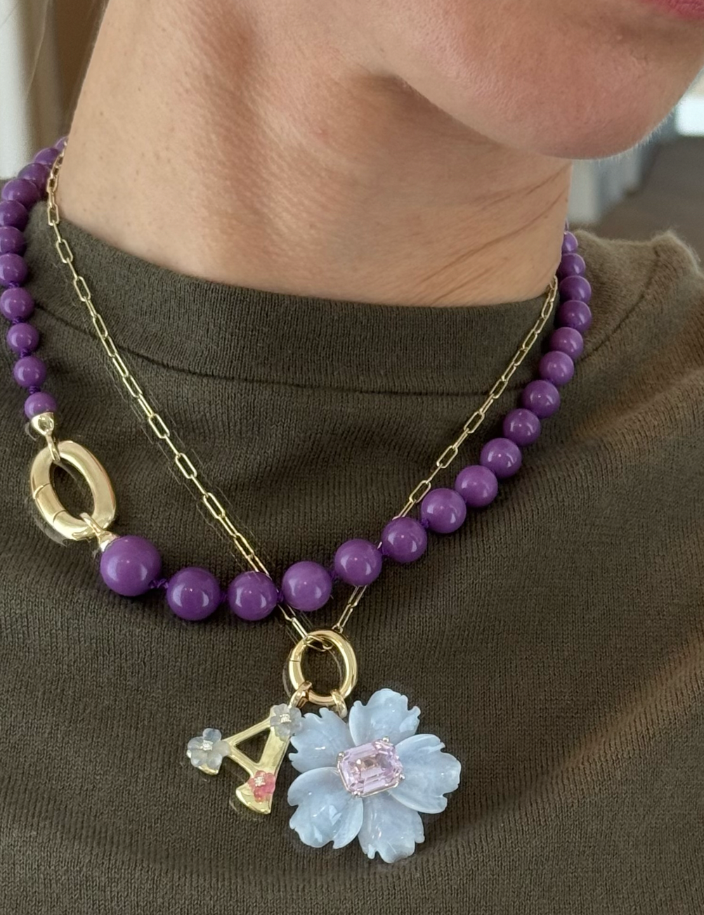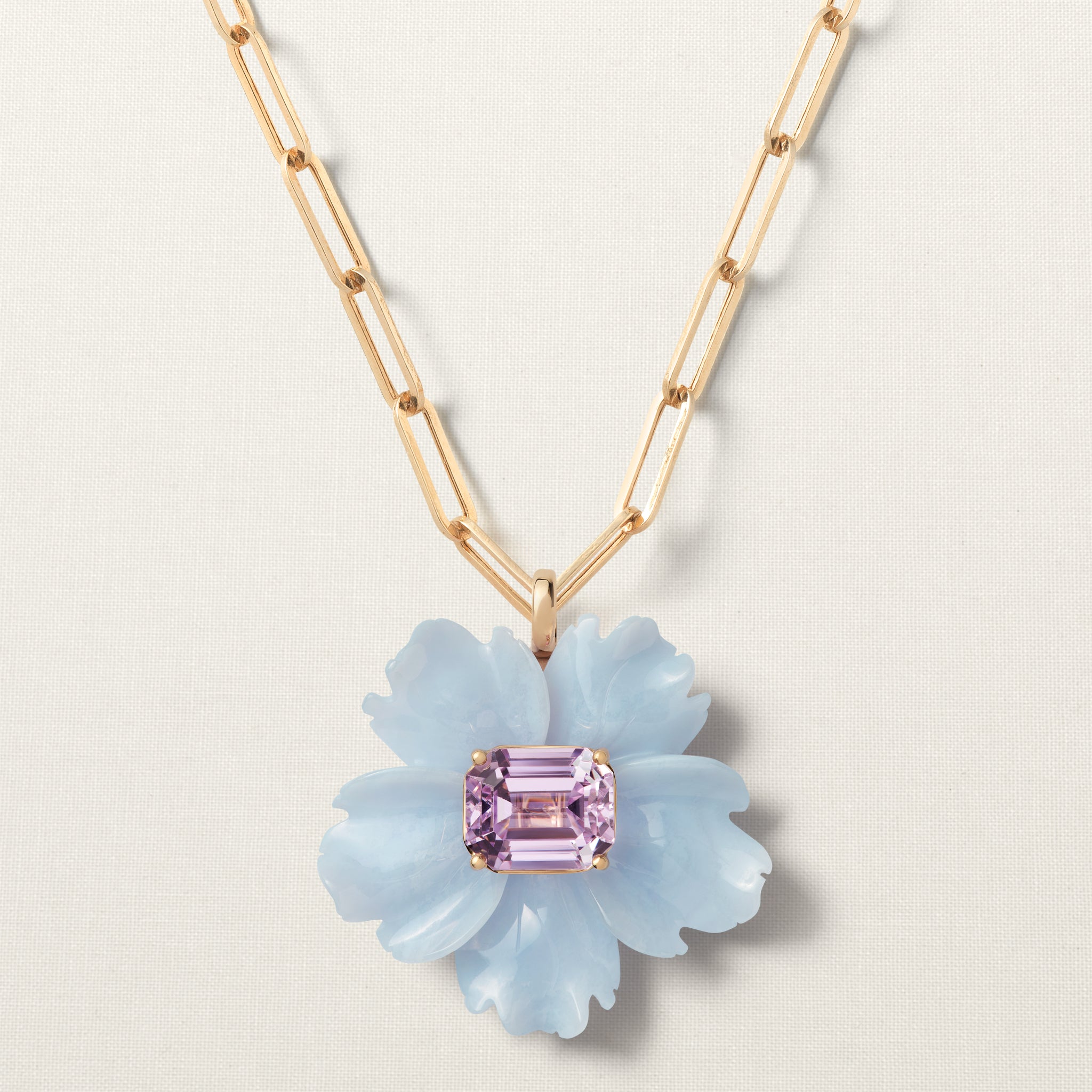 The Flower pendant is set with a brilliant-cut kunzite. Kunzite stands for emotional healing, unconditional love, and inner peace.