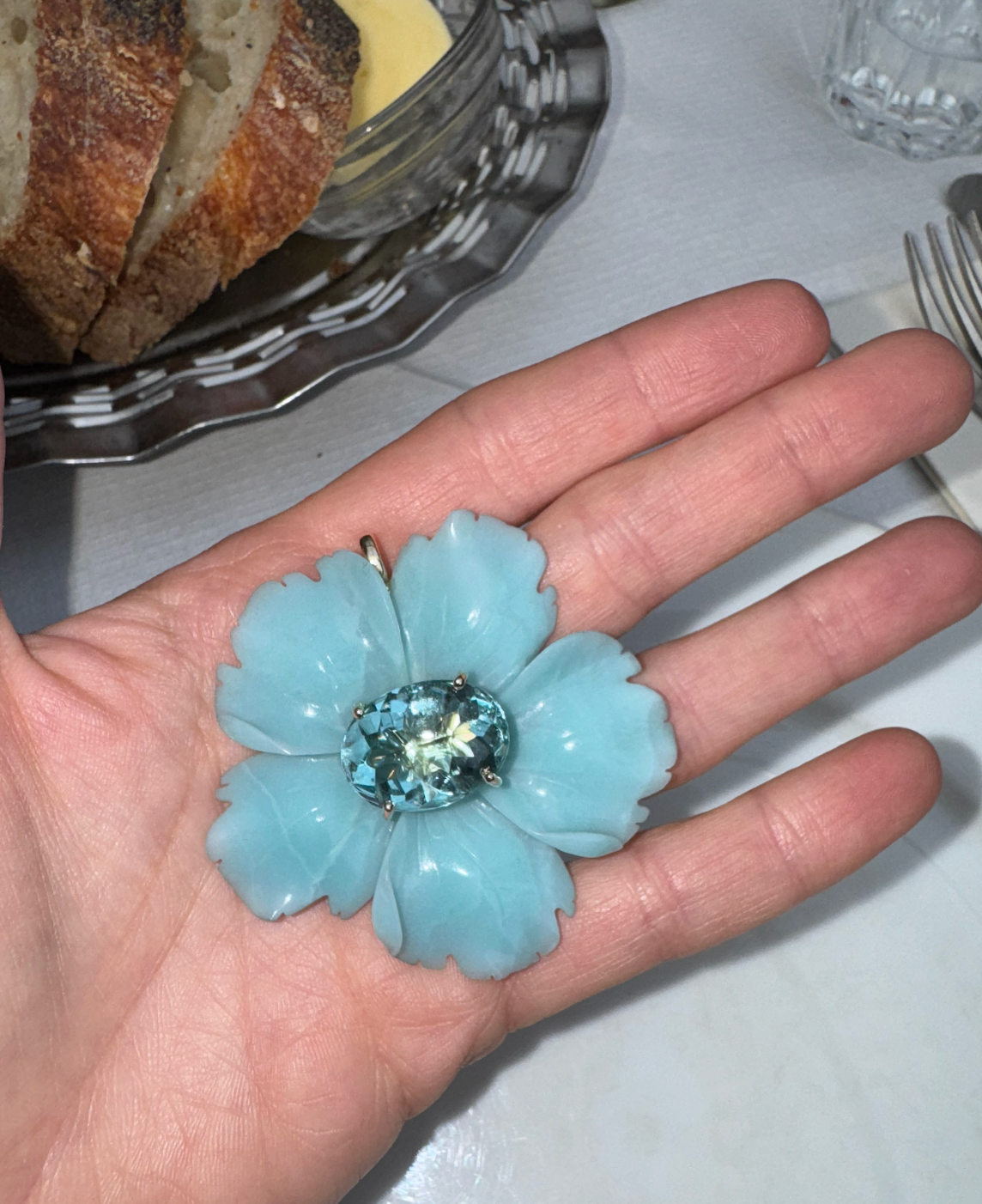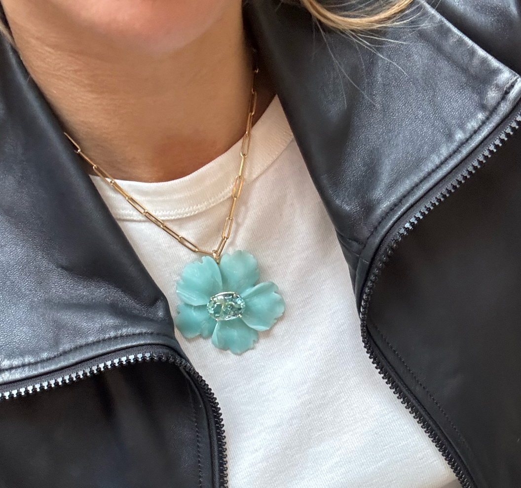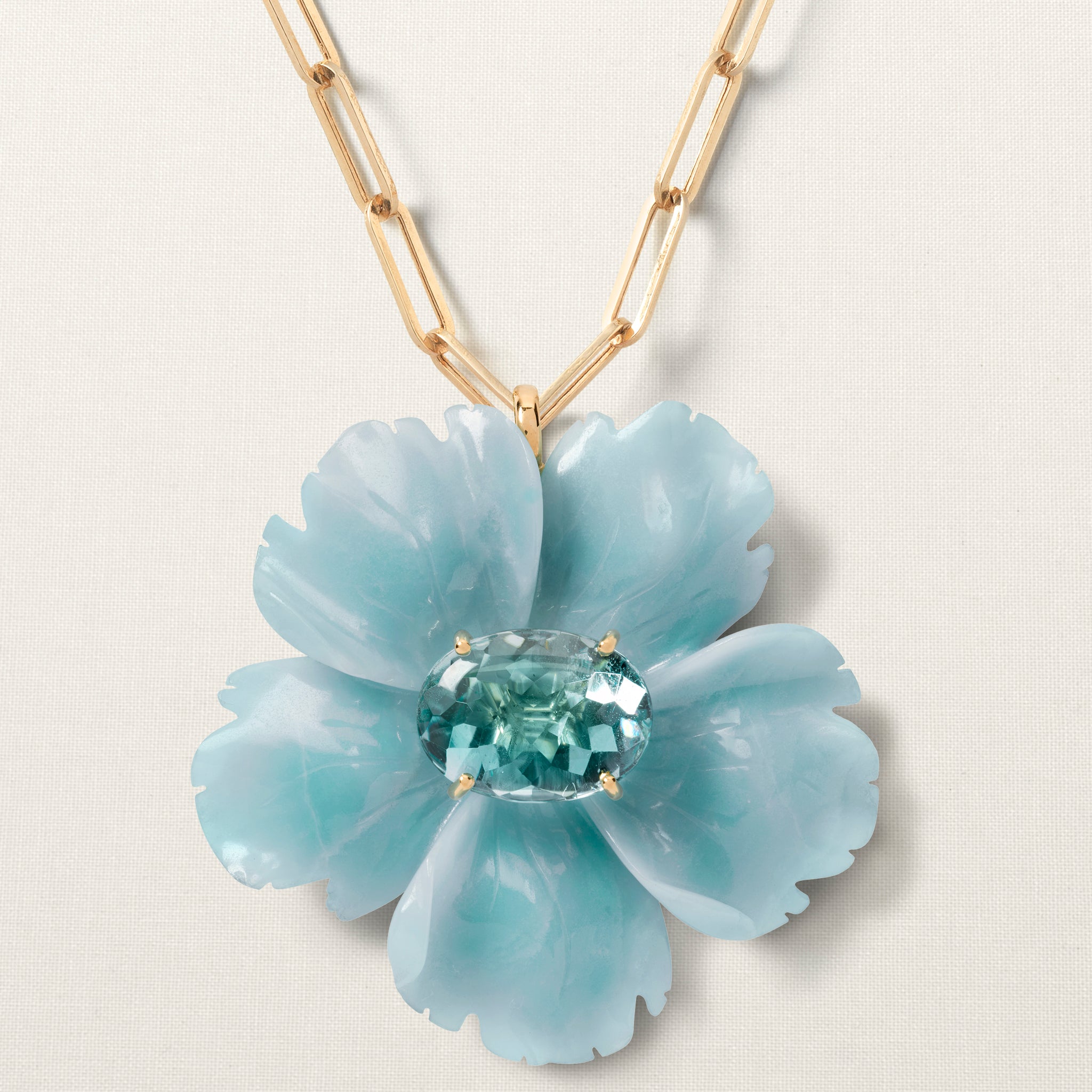 Inspired by the Flower of Lanzarote. The Reef Flower is hand-carved in Italy from high-quality amazonite and is set with a brilliant-cut Aquamarine. Aquamarine helps move towards closure, allowing space for peace and tranquillity.