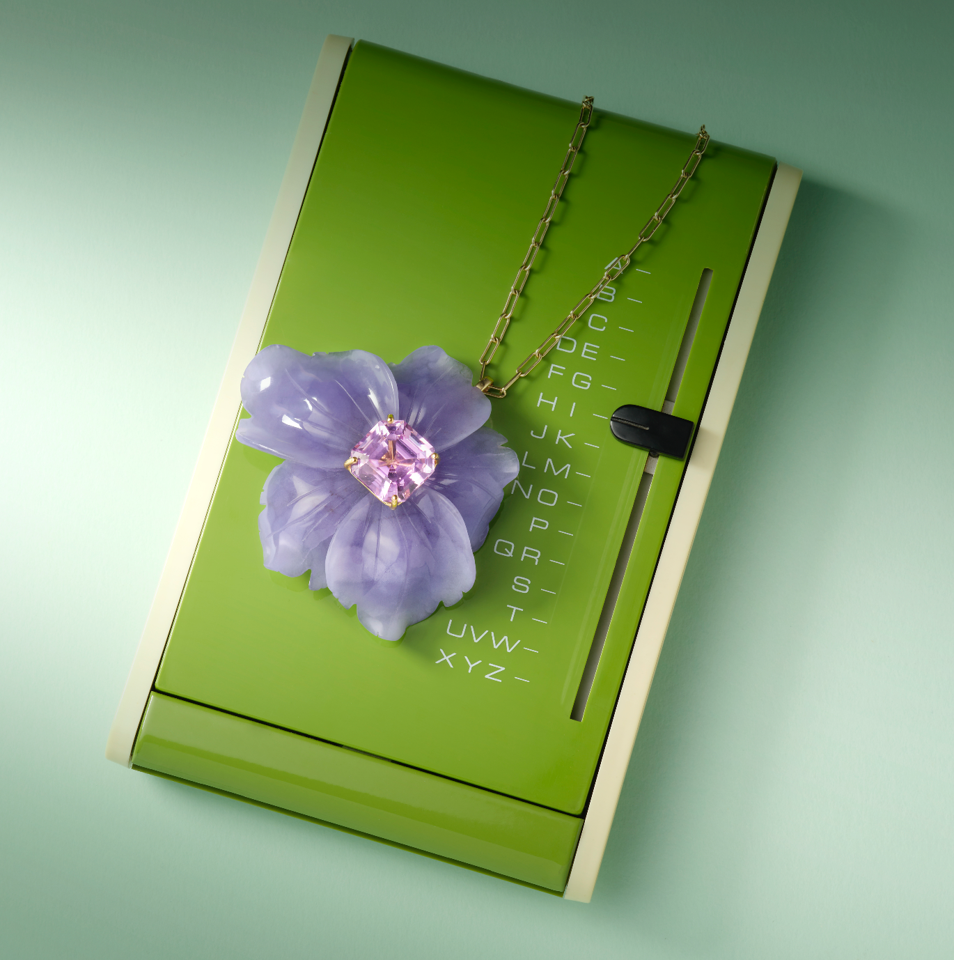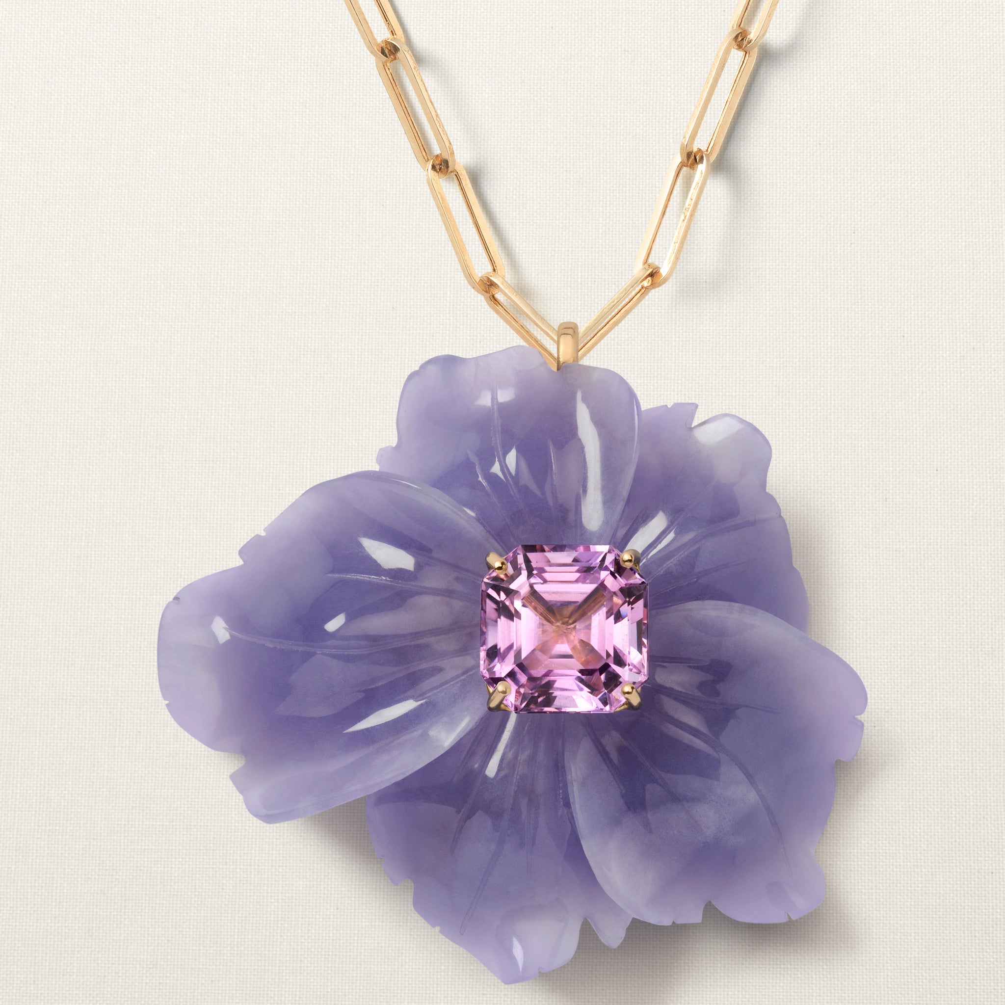 The flower is hand-carved in Italy from high-quality chalcedony and set with a brilliant-cut kunzite. Known as a stone of the heart, kunzite opens one to unconditional love, emotional healing, and inner calm.