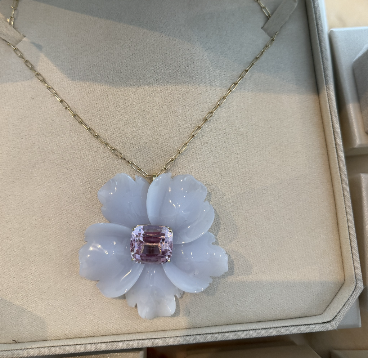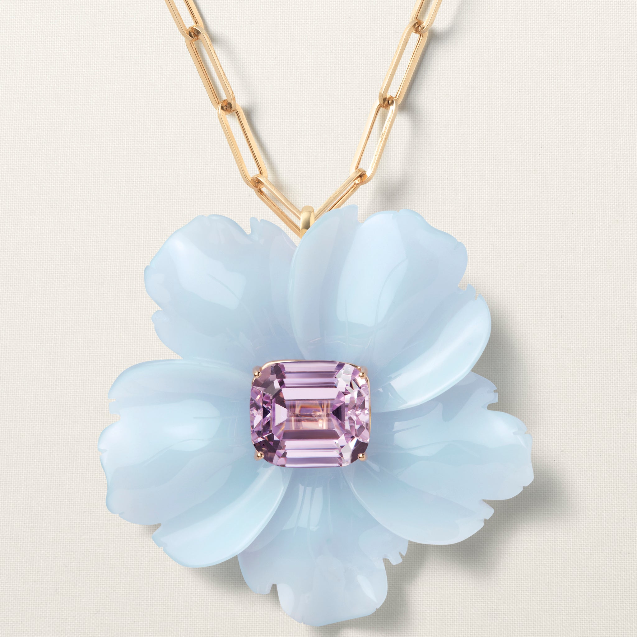 Inspired by the Flower of Lanzarote. The Reef Flower is hand-carved in Italy from high-quality chalcedony and is set with a brilliant-cut Kunzite. The ring is set with a brilliant-cut kunzite. Kunzite is said to open the heart chakra, promoting unconditional love and compassion.