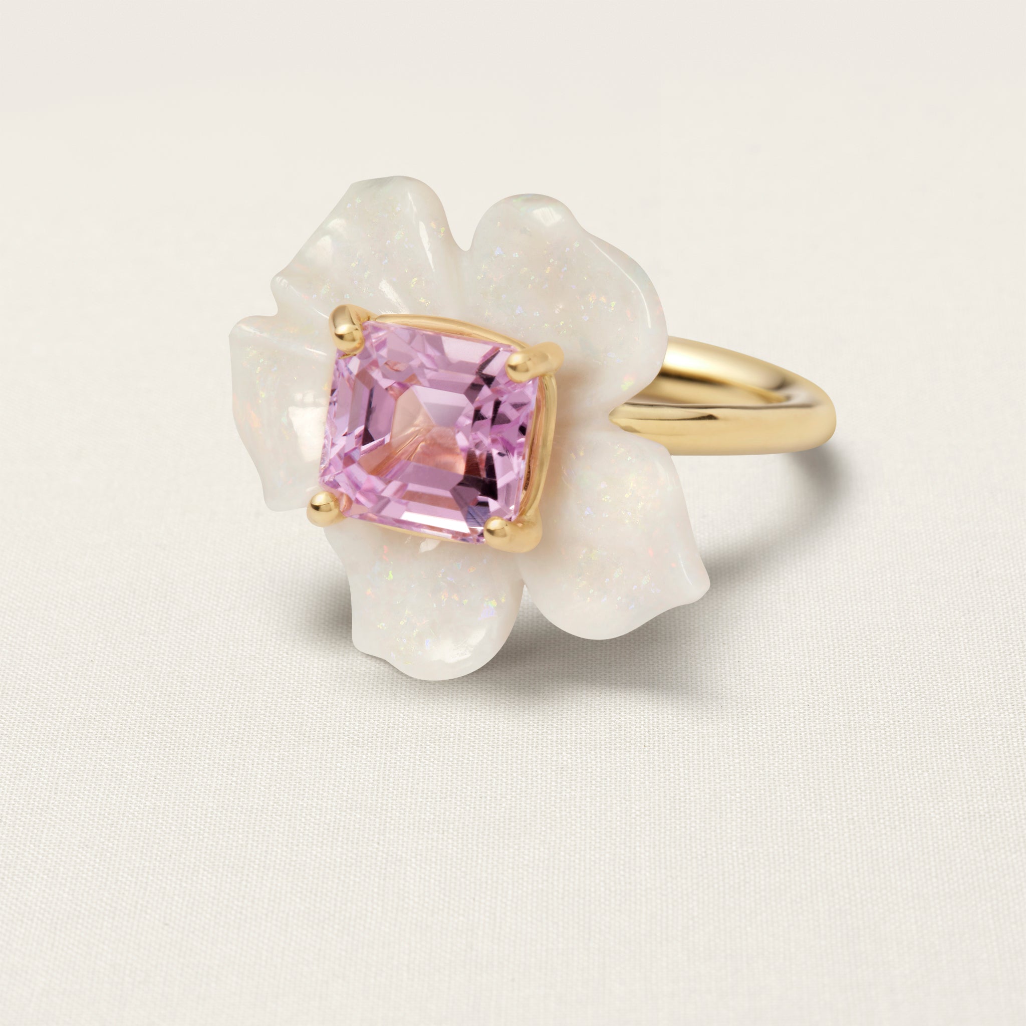 The ring is set with a brilliant-cut kunzite. Kunzite is said to open the heart chakra, promoting unconditional love and compassion.