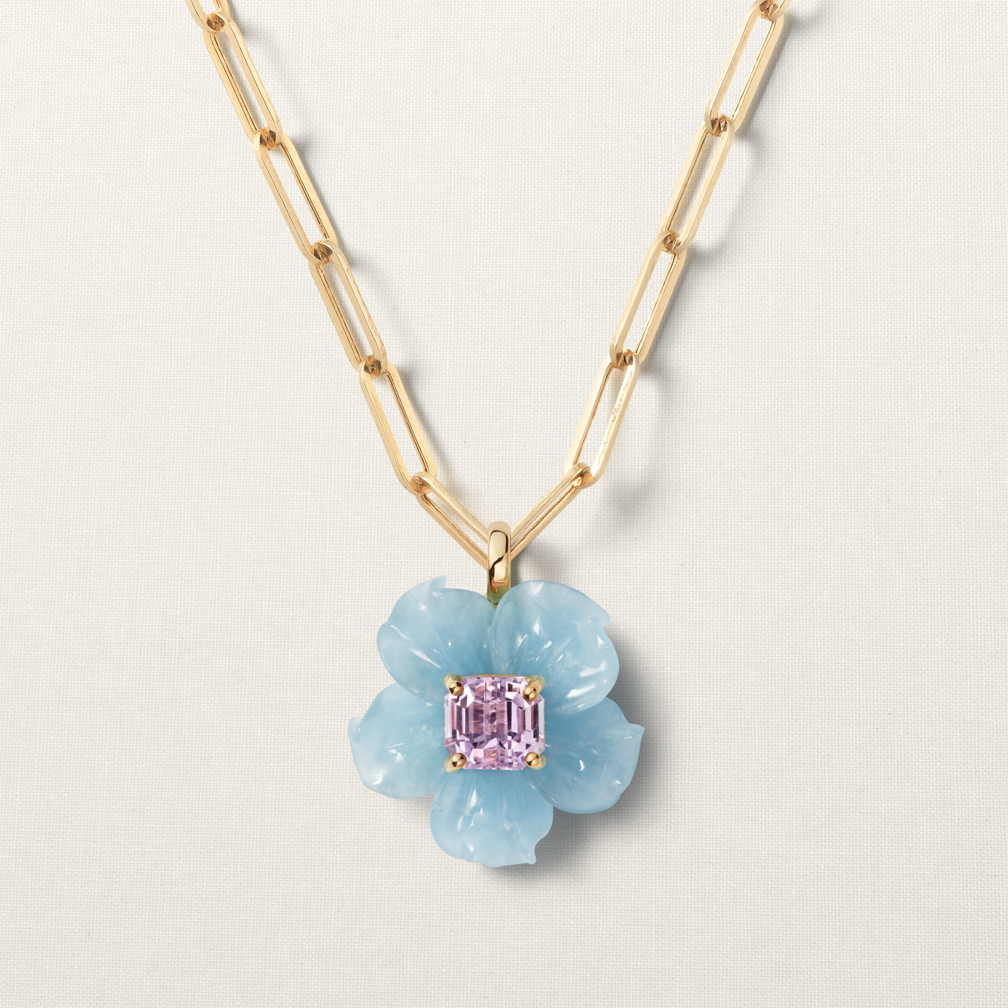 The Flower pendant is set with a brilliant-cut kunzite. Kunzite stands for emotional healing, unconditional love, and inner peace.