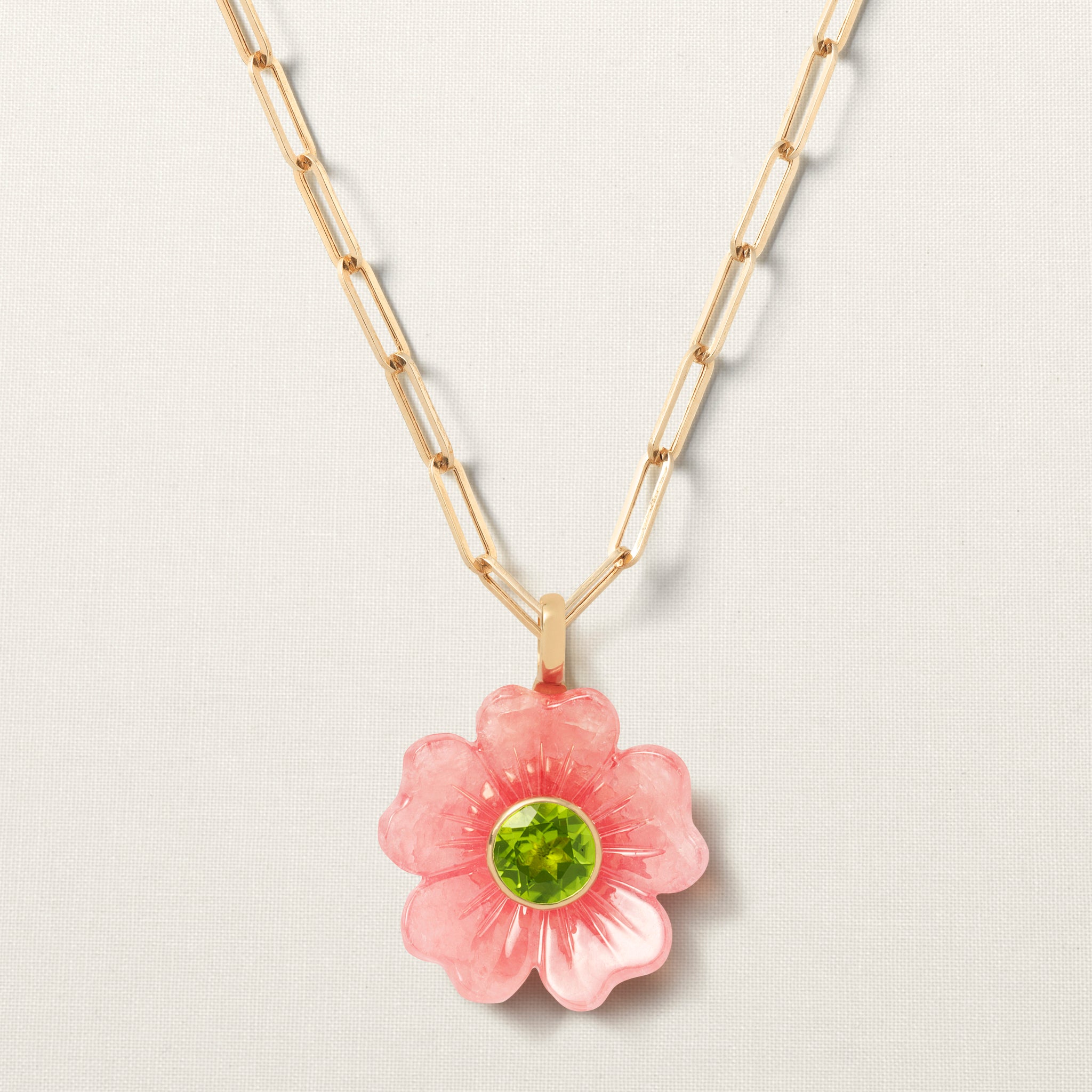 The flower on this iconic Sophie Joanne pendant is hand-carved from rhodochrosite by an expert artisan, using an age-old, stone-carving technique. Rhodochrosite can boost self-esteem and confidence. It encourages a positive attitude towards oneself and helps to dispel feelings of inadequacy.