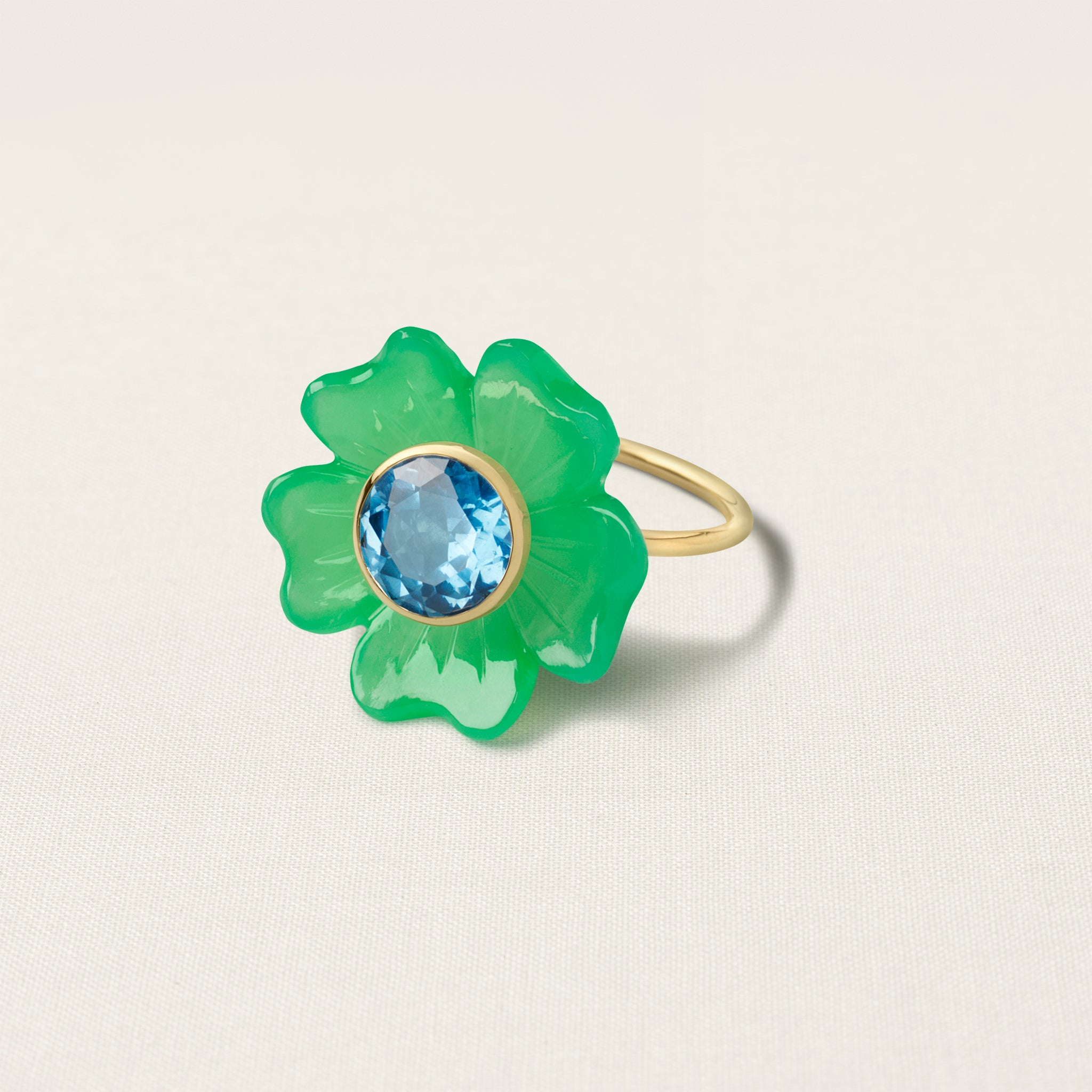 The flower on this iconic Sophie Joanne ring is hand-carved from chrysoprase by an expert artisan, using an age-old, wood-carving technique. Chrysoprase traditionally symbolizes happiness, enterprise, and prudence.
