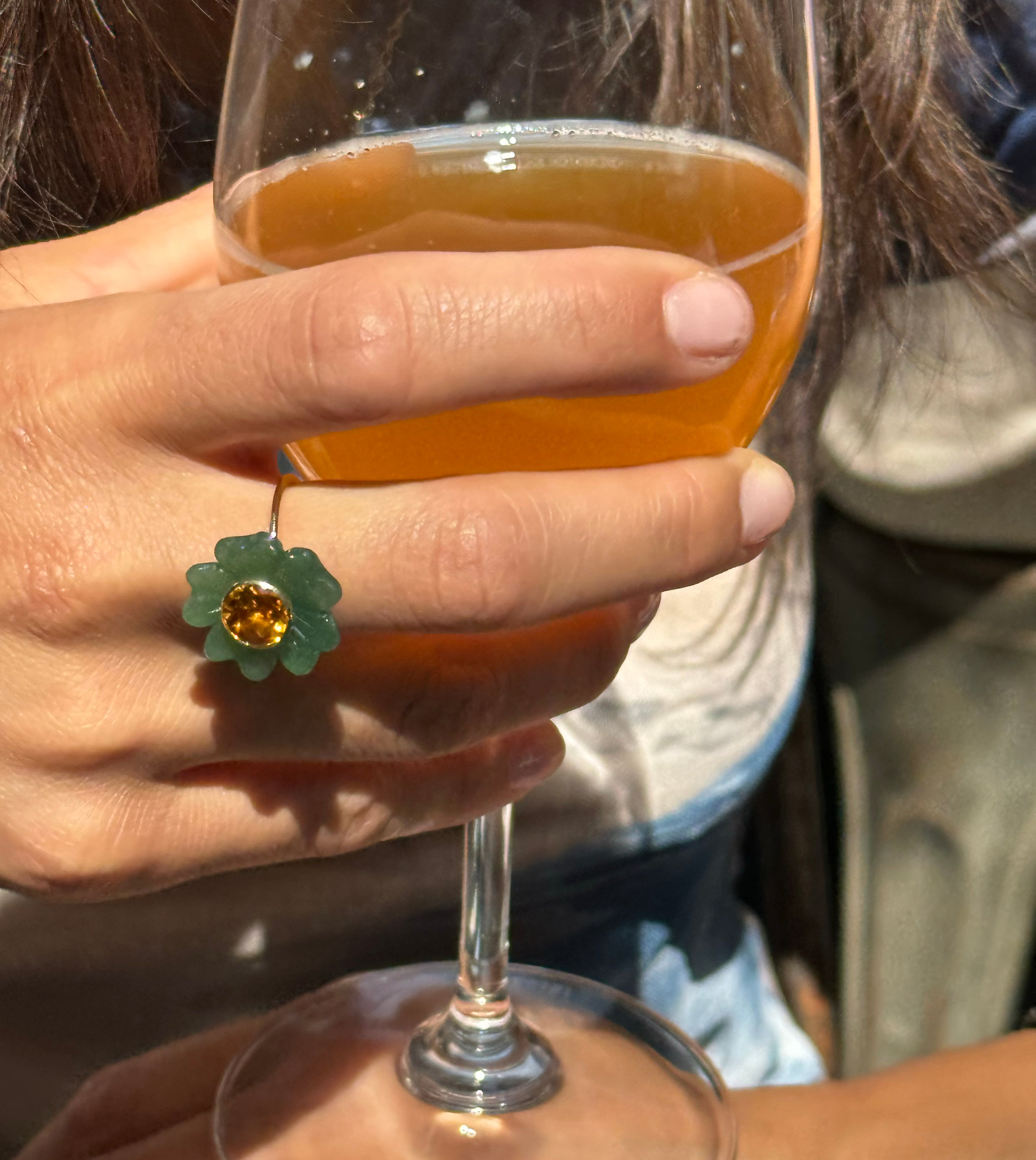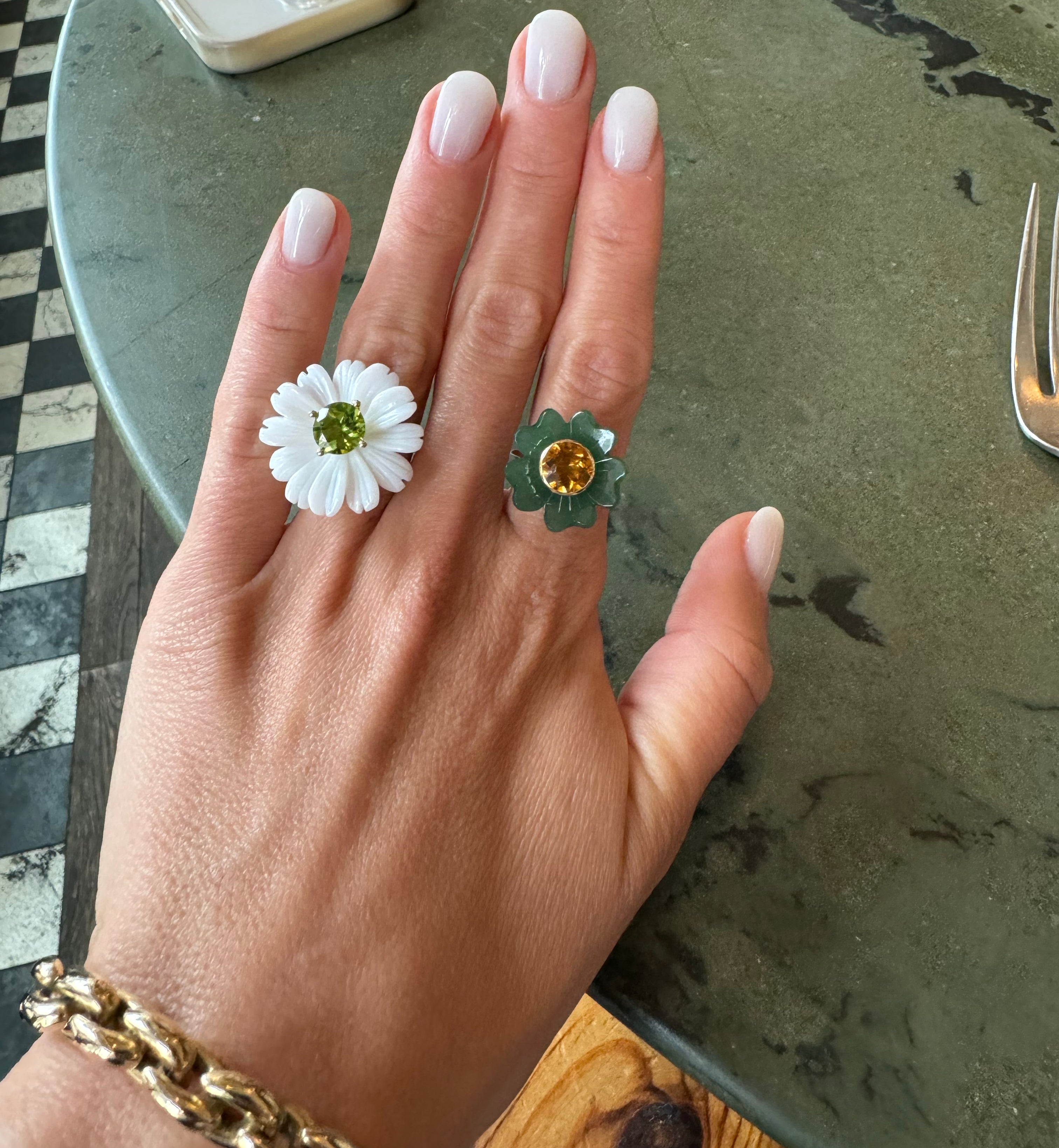 The flower on this iconic Sophie Joanne ring is hand-carved from jade by an expert artisan, using an age-old, wood-carving technique. Jade is often considered a protective stone, warding off negative energies and bringing harmony to the wearer.