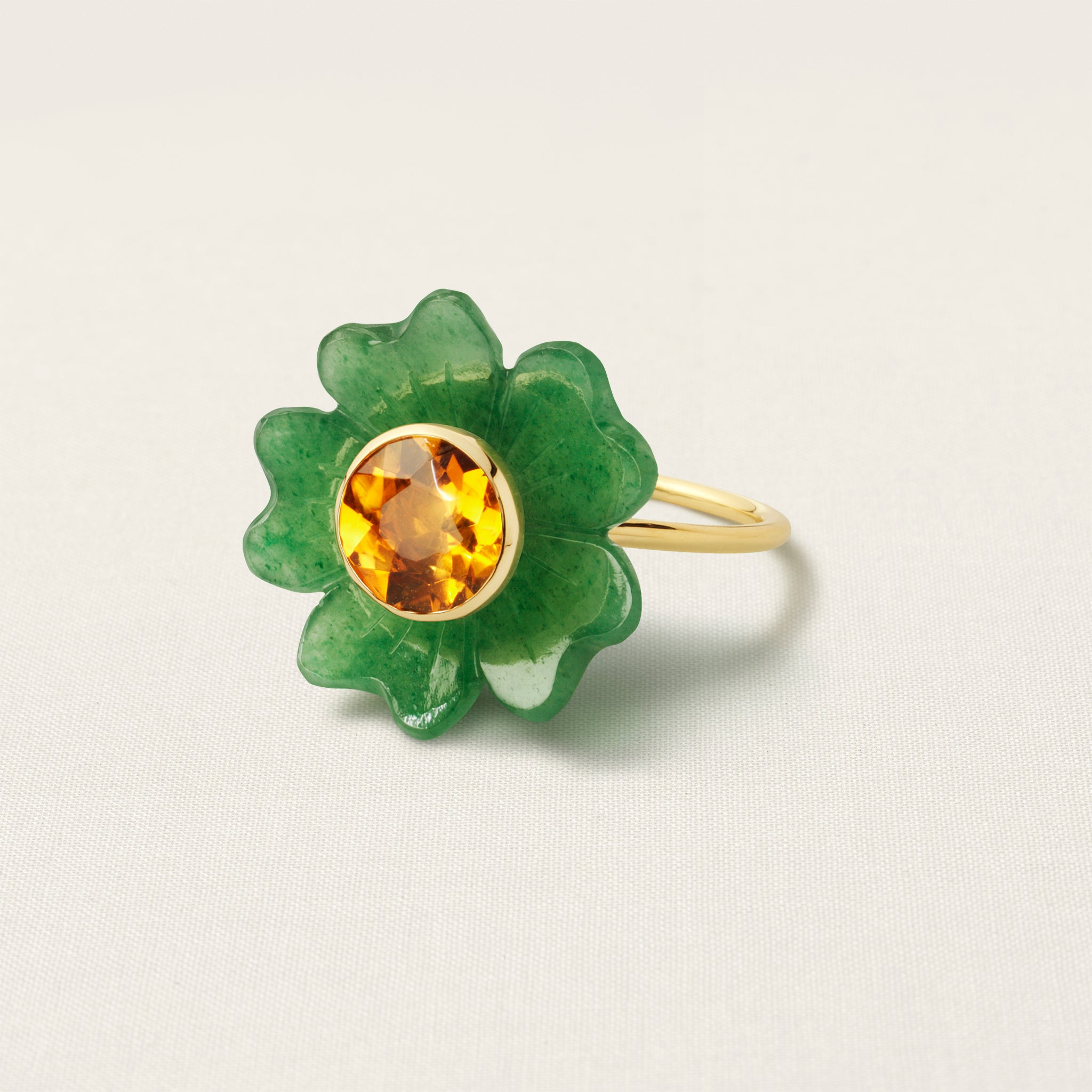 The medium size flower ring is a new size that we are working with. We combine the small flower carving with a big center stone more gold work around it. The ring is set with a brilliant-cut citrine, which symbolizes happiness and light and opens you up to positive opportunities.