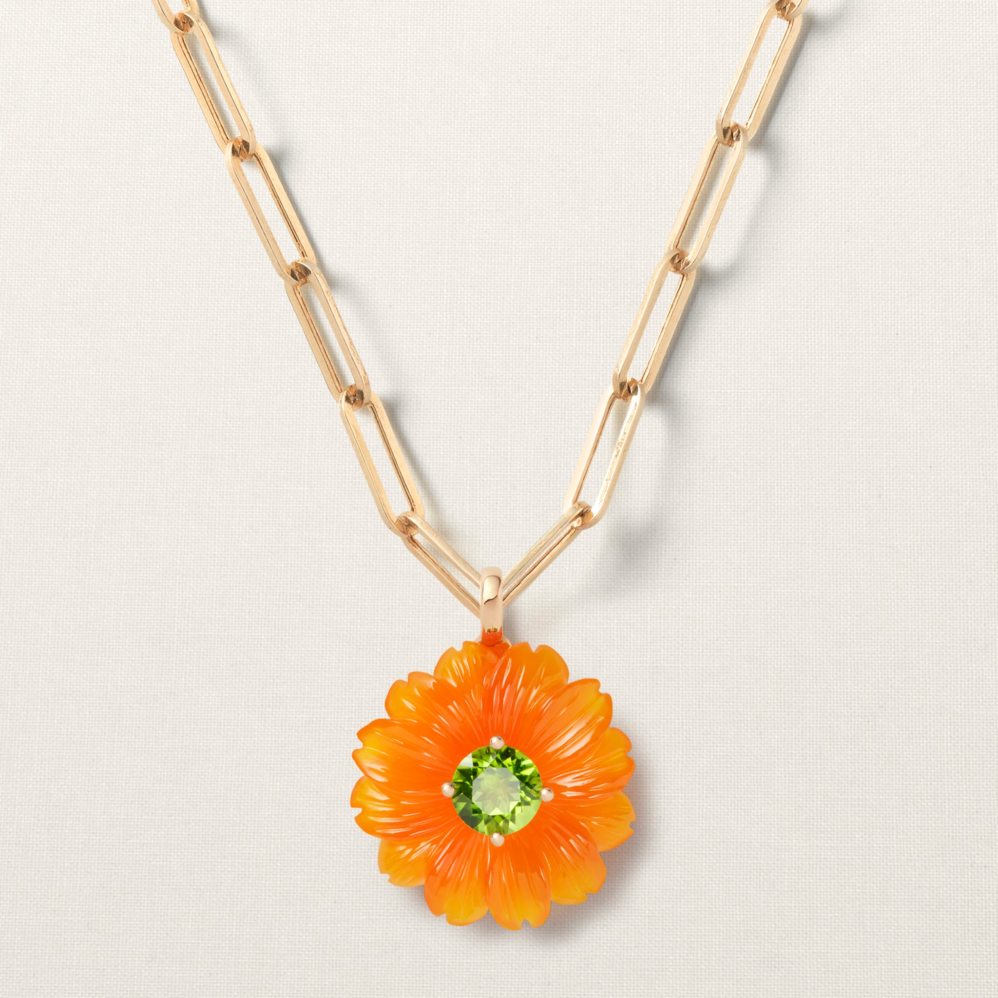 Inspired by the Flowers of Lanzarote. The Wild Flower pendant is hand-carved in Italy from high-quality carnelian. This ring is set with a brilliant-cut peridot. Peridot symbolizes positive energy.